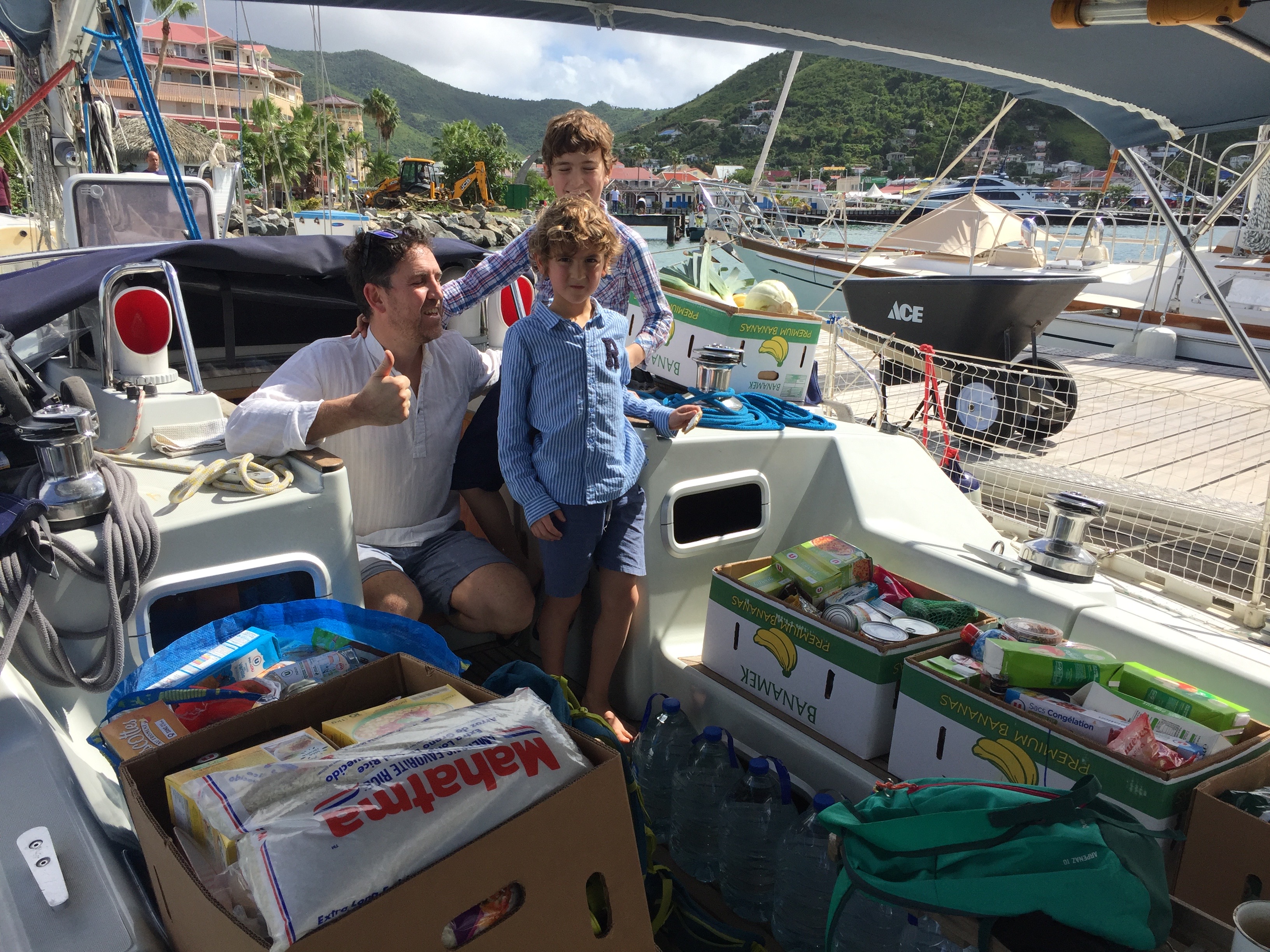 Vol avec escale check, bateau trouvé dans la marina, clefs cachées dans le premier pli de la grand voile trouvées, avitaillement fait en moins de 3 heures au Super U de Marigot, manoeuvre au port par 25 noeuds de vent, ancre mouillée dans 3 m d’eau et toujours 25 noeuds avec des rafales jusqu’à 38noeuds. Le marathon de l’arrivée fait en 36 heures, ouf, puis prise en main du navire par toute la famille.