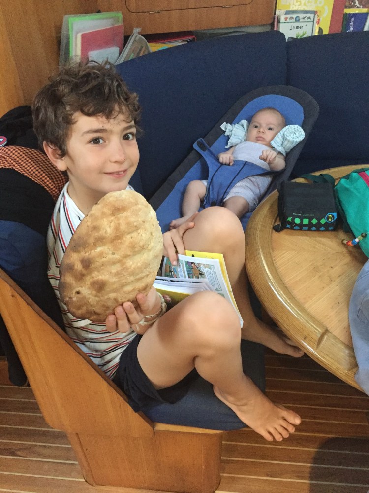 Le premier soir, parents débordés, bateau complètement en vrac, les enfants vont se coucher avant de manger…! Le deuxième soir, les choses rentrent plus ou moins dans l’ordre, disons qu’on arrive à boire l’apéro et les enfants vont se coucher (encore une fois avant le diner…!) et dès le troisième jour nos petits rituels s’installent. Ecole au bateau 2h le matin, préparation du pain (Merci Claire et Doudou pour le levain), cuisine, baignade, plage, baignade et rebaignade, tété, bain de Timaël suivi de lessive de couche! La vie de famille sans contrainte extérieur autre que la météo et le rythme des matelots. Alors on prend le temps !