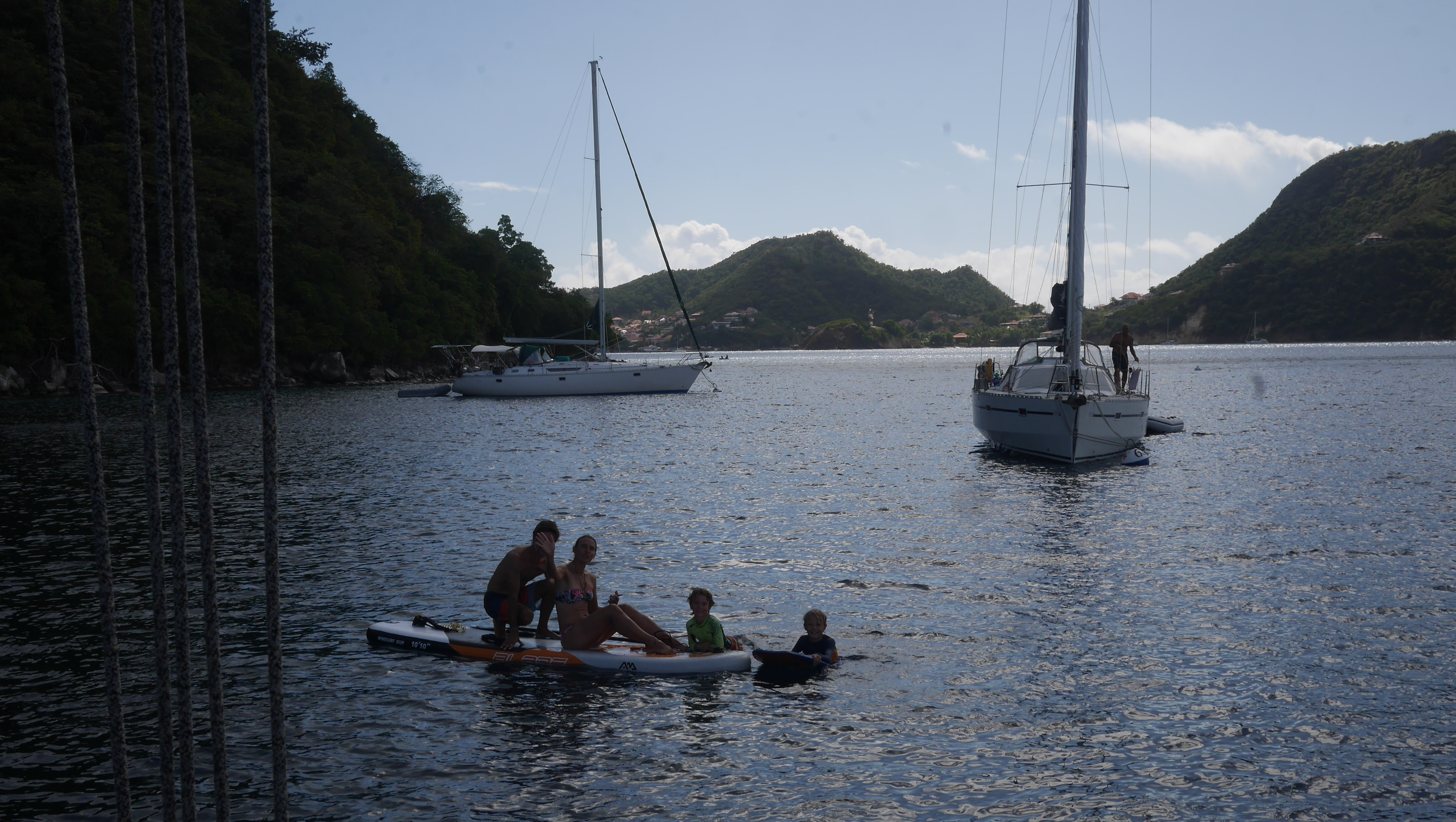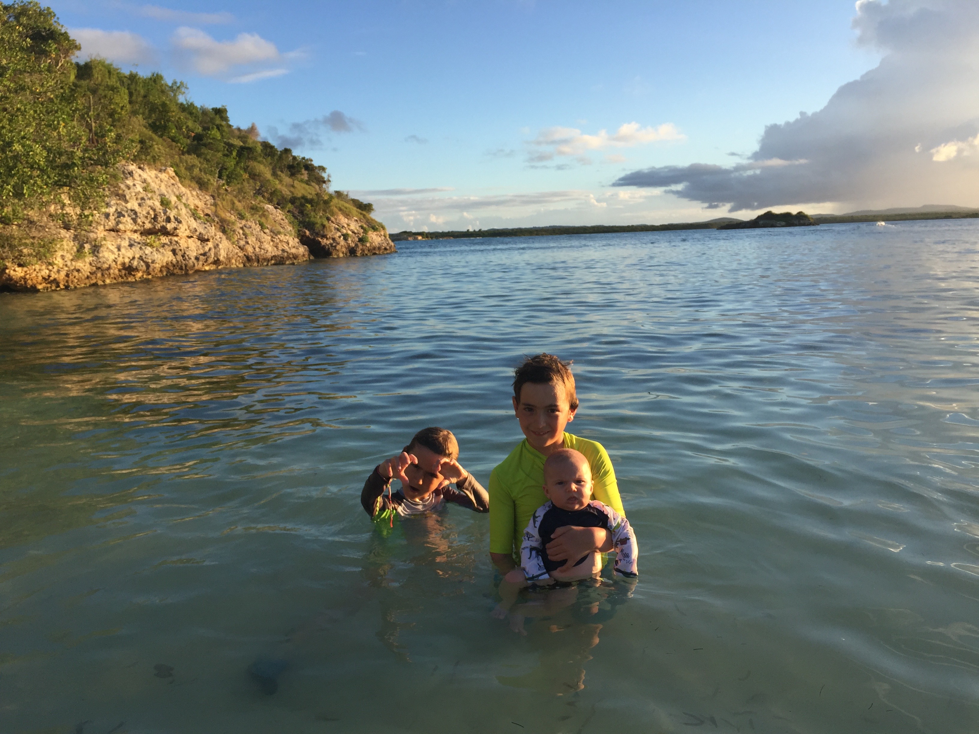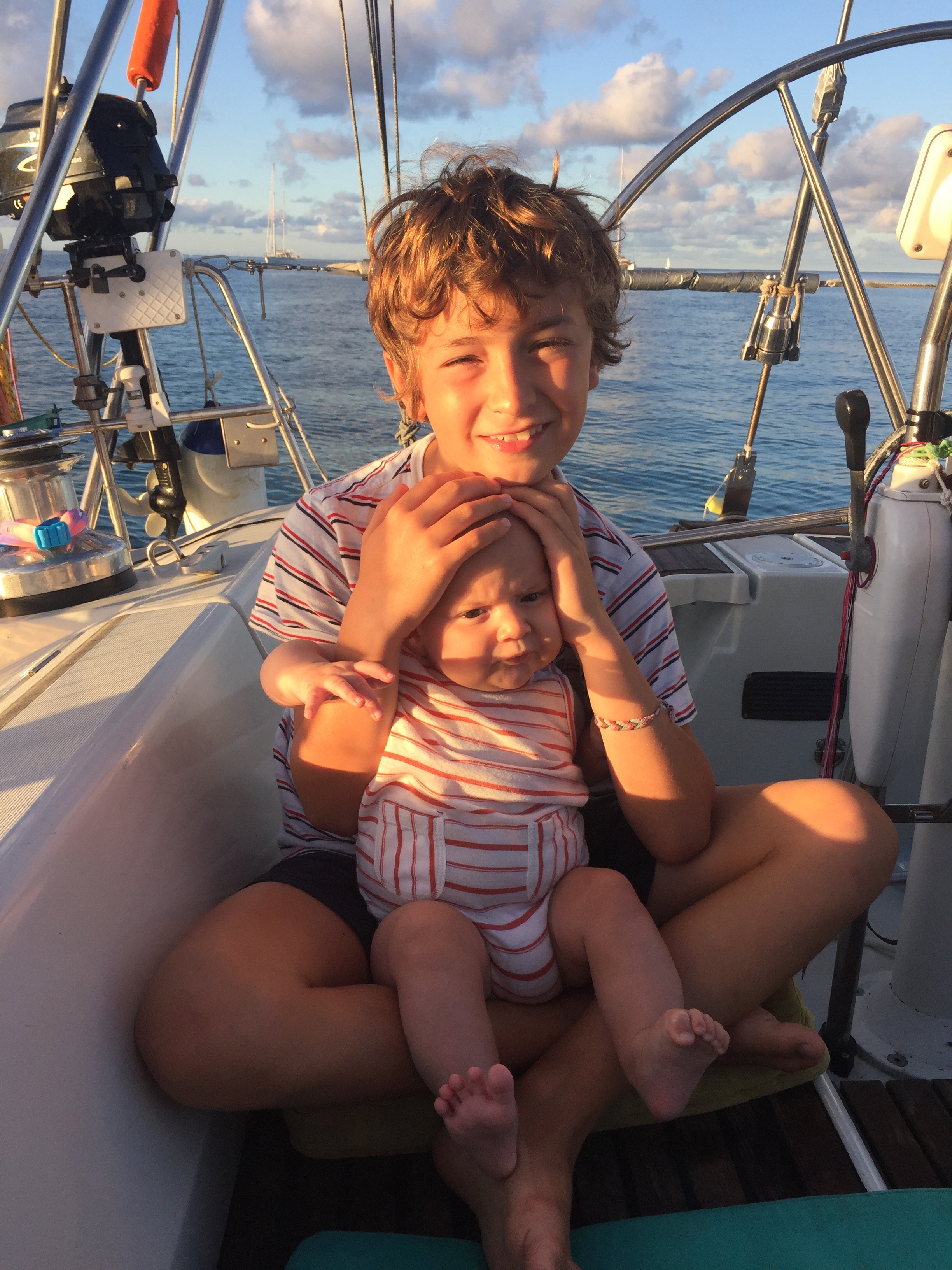 Ca fait un mois que nous naviguons, Timaël à 2 mois et demi, heureusement nous dormons presque toutes les nuits mais nous sommes épuisés. Faire le pain, mettre l’eau potable en bouteille, faire à manger 3 fois par jour, monter et descendre cette descente à 5 marches 278 fois par jours, faire la lessive, la lessive de couche, la vaisselle, faire les courses, faire l’école et trouver 1000 et une stratégies pour que ça se passe bien, trouver un abris chaque soir, se faire réveiller par les grands à 5 heures du matin, renverser son café parce que le mouillage roule… bref la vie à bord nous montre ses difficultés et nous tombons tous, comme des quilles, malades les uns après les autres, angine, otite, bronchite. La tempête bat son plein, les grains s’abattent sur le bateau toutes les demi-heure, l’ambiance du bord en pâti évidemment. Les Saintes, nous ne les verrons pas sous leur meilleurs angles… ! En contre-partie, étant donné que tout le monde est bloqué dans le même mouillage pendant la tempête, nous rencontrons plein de bateau copain, Mafaso, Jad et Noix de coco, et Freestyle revient en Guadeloupe. Evidemment, ce dont je me rends compte en racontant cet épisode, c’est que nous enchainons les apéros au bateau, au restau, sur la plage et chez les copains, ce qui n’est pas hyper propice au rétablissement. Et même une nuit au bateau sans les enfants qui sont invités à dormir chez les Mafaso0 ( Merci papy Jean-Marc !)