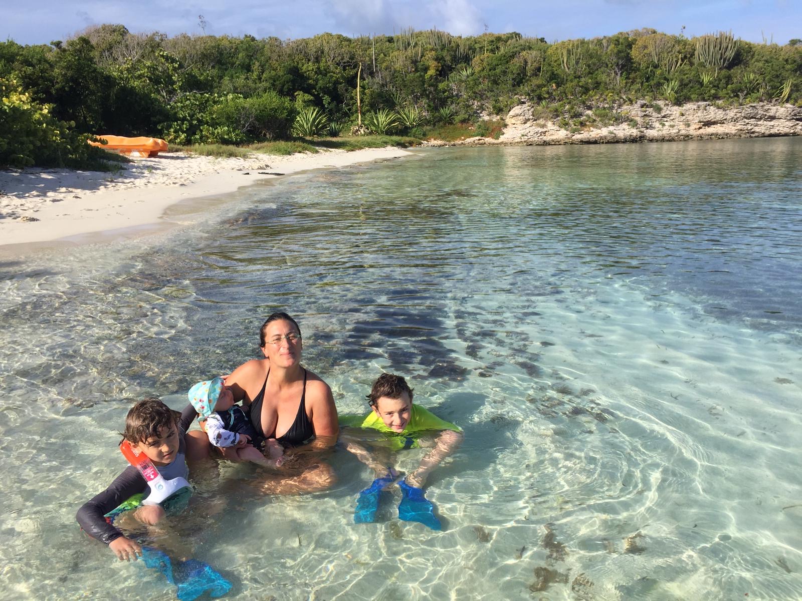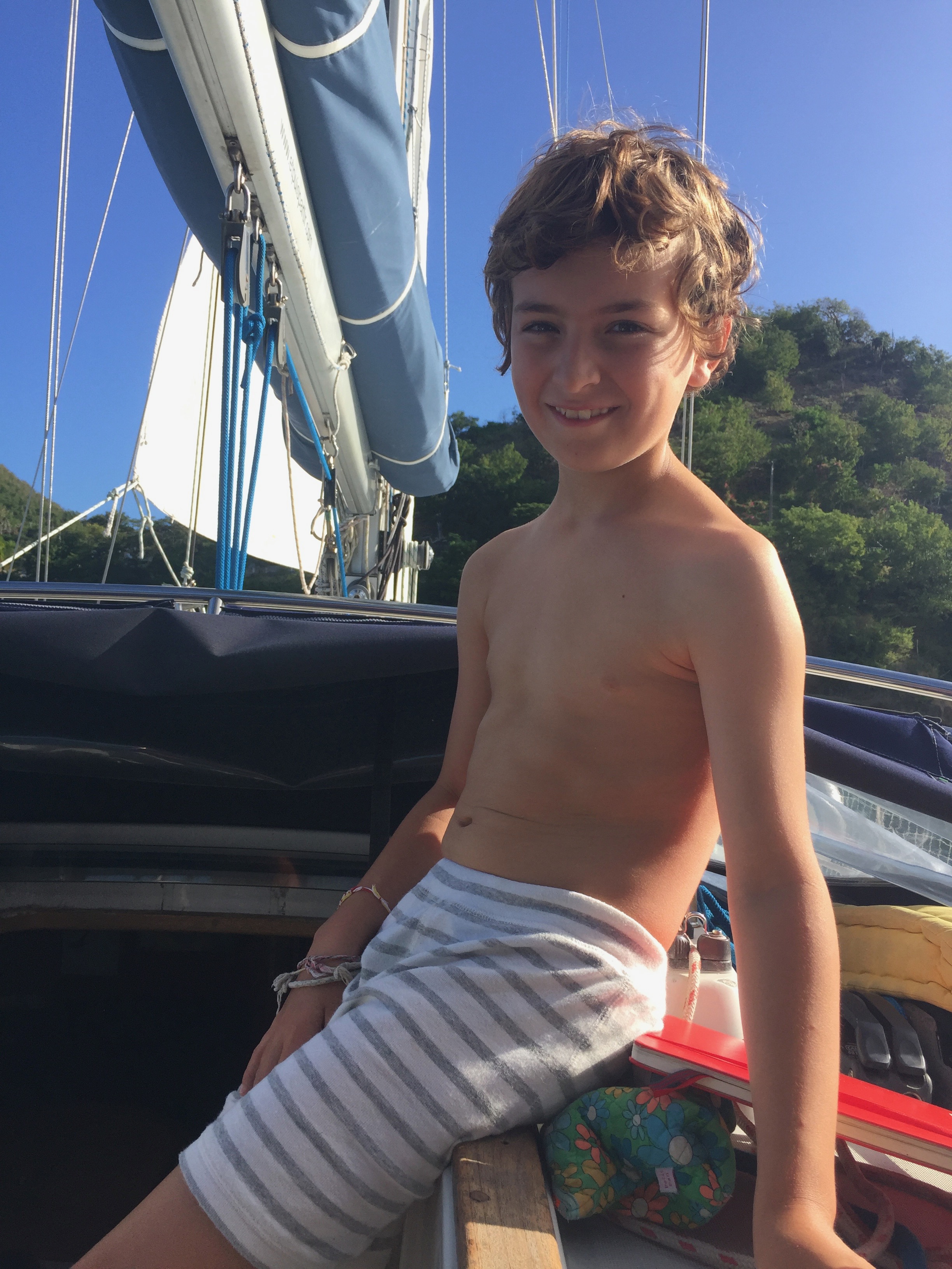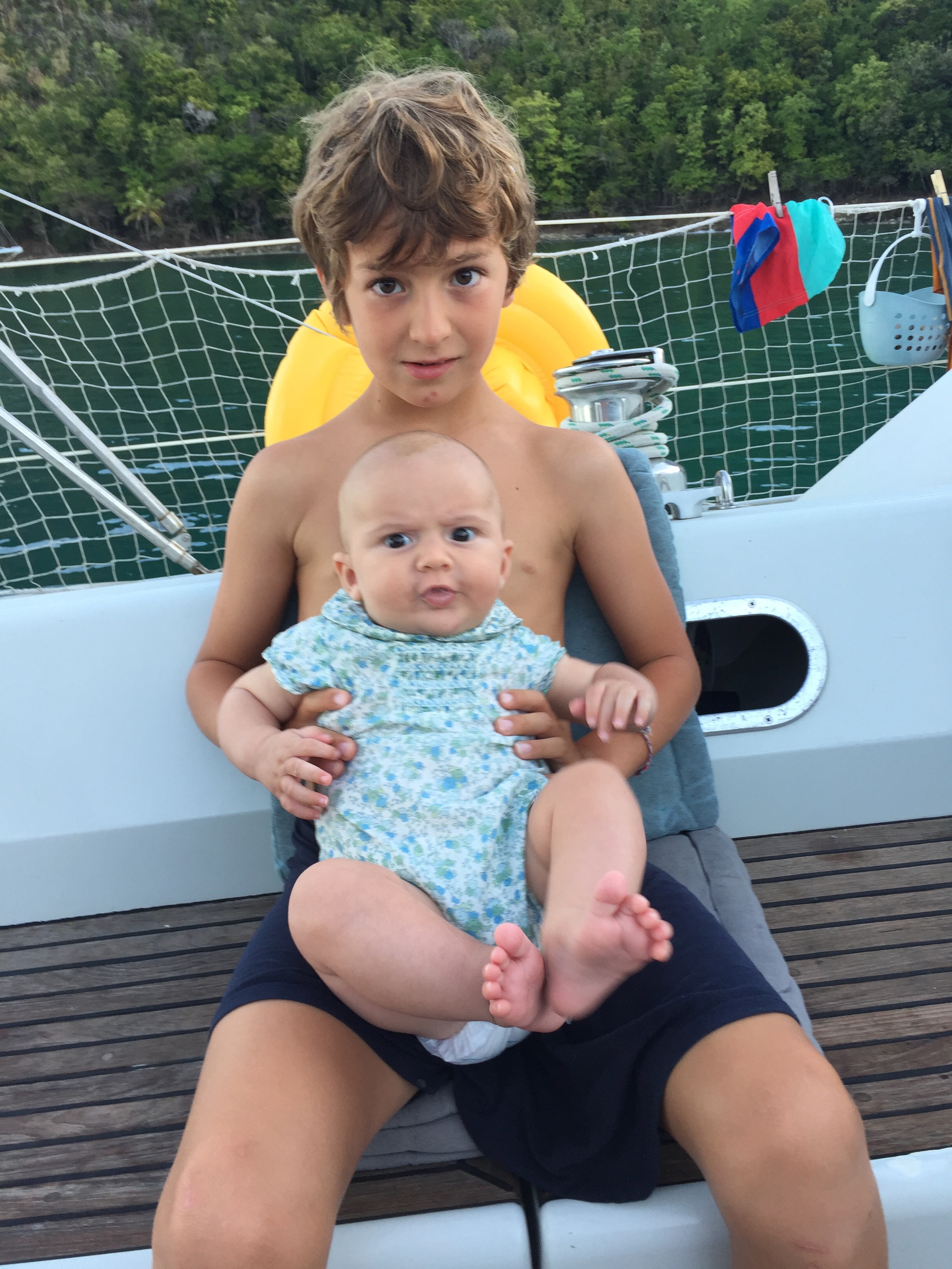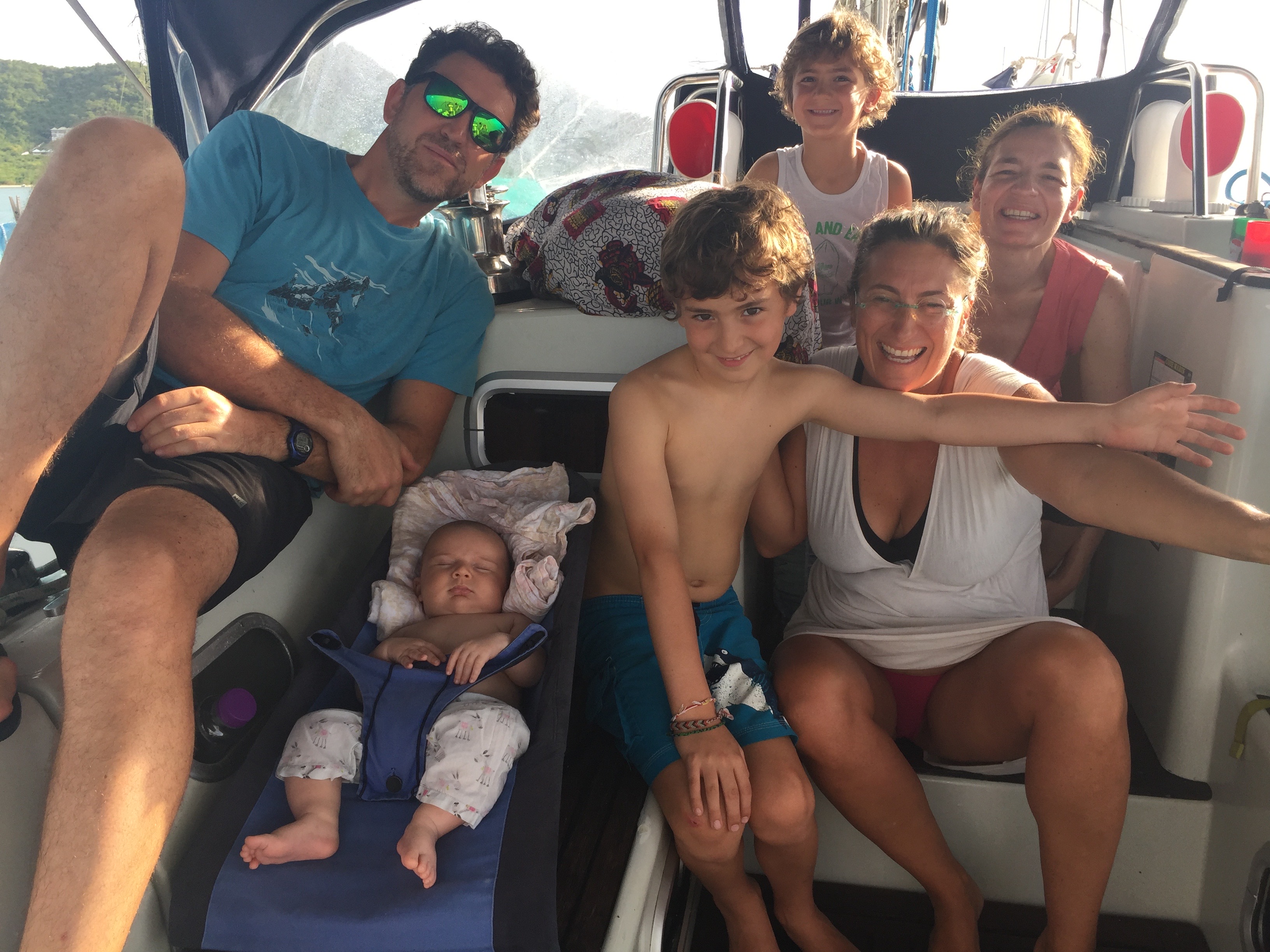 Ca fait un mois que nous naviguons, Timaël à 2 mois et demi, heureusement nous dormons presque toutes les nuits mais nous sommes épuisés. Faire le pain, mettre l’eau potable en bouteille, faire à manger 3 fois par jour, monter et descendre cette descente à 5 marches 278 fois par jours, faire la lessive, la lessive de couche, la vaisselle, faire les courses, faire l’école et trouver 1000 et une stratégies pour que ça se passe bien, trouver un abris chaque soir, se faire réveiller par les grands à 5 heures du matin, renverser son café parce que le mouillage roule… bref la vie à bord nous montre ses difficultés et nous tombons tous, comme des quilles, malades les uns après les autres, angine, otite, bronchite. La tempête bat son plein, les grains s’abattent sur le bateau toutes les demi-heure, l’ambiance du bord en pâti évidemment. Les Saintes, nous ne les verrons pas sous leur meilleurs angles… ! En contre-partie, étant donné que tout le monde est bloqué dans le même mouillage pendant la tempête, nous rencontrons plein de bateau copain, Mafaso, Jad et Noix de coco, et Freestyle revient en Guadeloupe. Evidemment, ce dont je me rends compte en racontant cet épisode, c’est que nous enchainons les apéros au bateau, au restau, sur la plage et chez les copains, ce qui n’est pas hyper propice au rétablissement. Et même une nuit au bateau sans les enfants qui sont invités à dormir chez les Mafaso0 ( Merci papy Jean-Marc !)