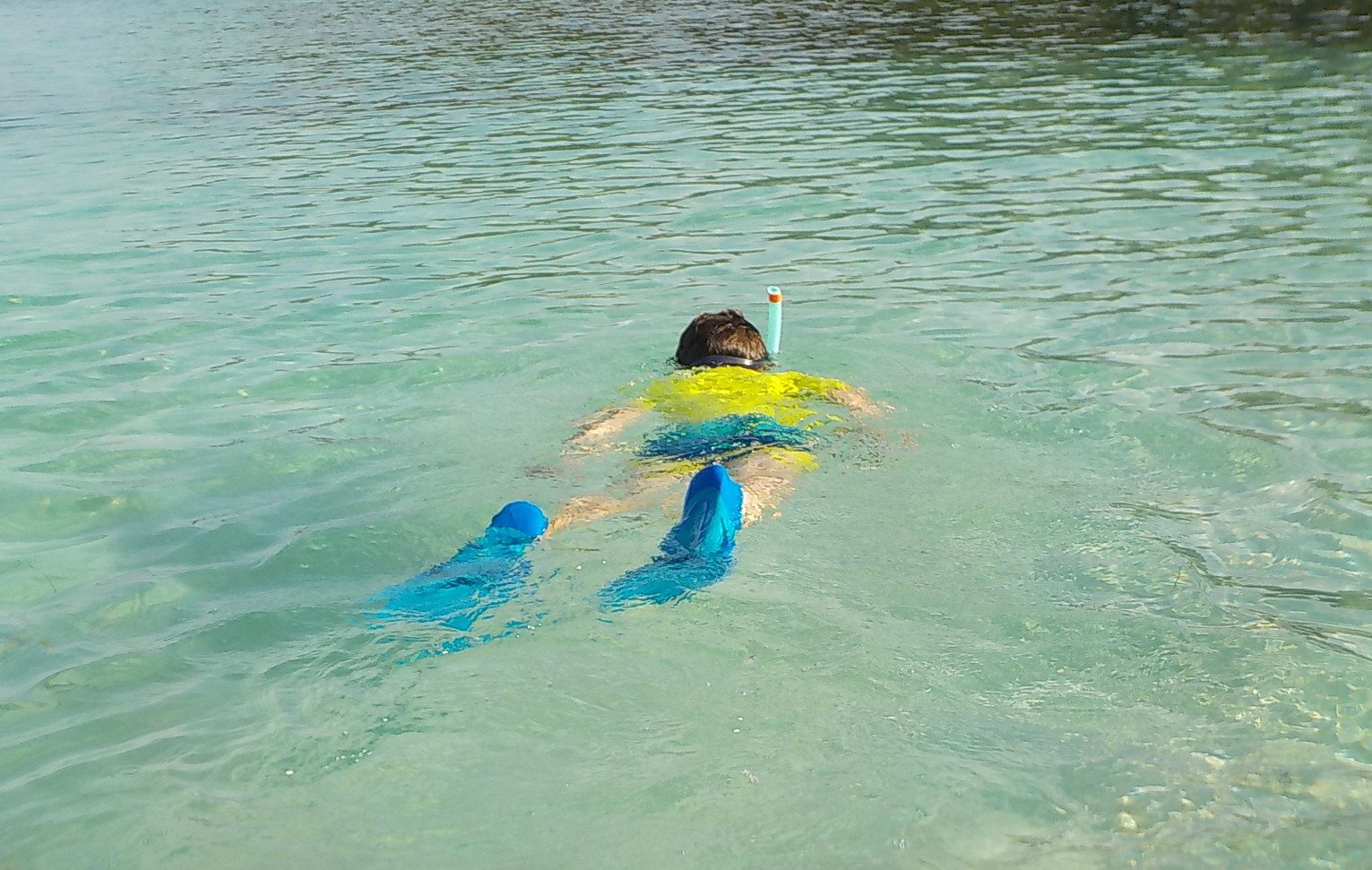 Palme, masque, tuba, cosy, biberon d’eau, crème solaire, les copains nous croisent avec des gros yeux quand ils aperçoivent Timaël au milieu d’une barrière de corail! Première équipe Lou et moi, moins d’une minute après avoir plongé, je me retrouve nez à nez avec un requin de plus de 2m, oups, Lou est quelques mètres derrière, sans l’inquiéter je le ramène fissa fissa à l’annexe. Ce sont des requins nourrices qui chassent plutôt la nuit et n’attaquent pas l’homme s’il ne l’agresse pas, hyper impressionnant tout de même. On croise plus tard des raies pastenagues et des poissons bourses, des sergents major et des carangues, des chirurgiens et diodons de roche. Plongée fascinante par l’ampleur de la barrière. Le lendemain nous repartons en famille pour une seconde plongée sur une bouée plus loin, proche des vagues qui éclatent sur le récif, la mer est très agitée, il y a du courant, nous sommes sur la seule passe qui envoie vers le large au niveau du tombant. Un peu moins rassurant que l’intérieur du lagon. Le spectacle est grandiose, des dizaines d’espèces flottent dans le courant au-dessus de patates de corail gigantesques tandis qu’émerge des profondeurs une immense raie léopard. Emotion.