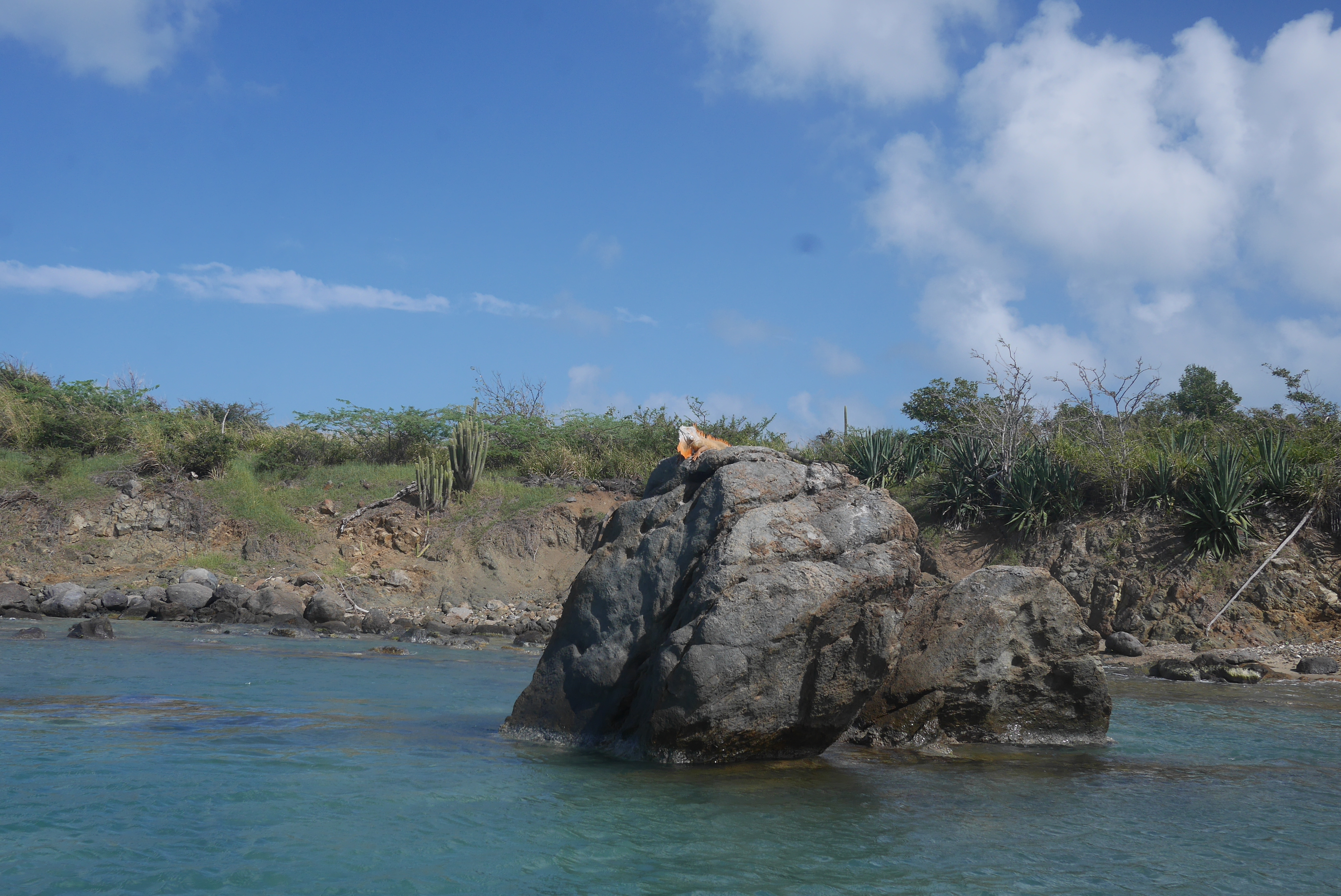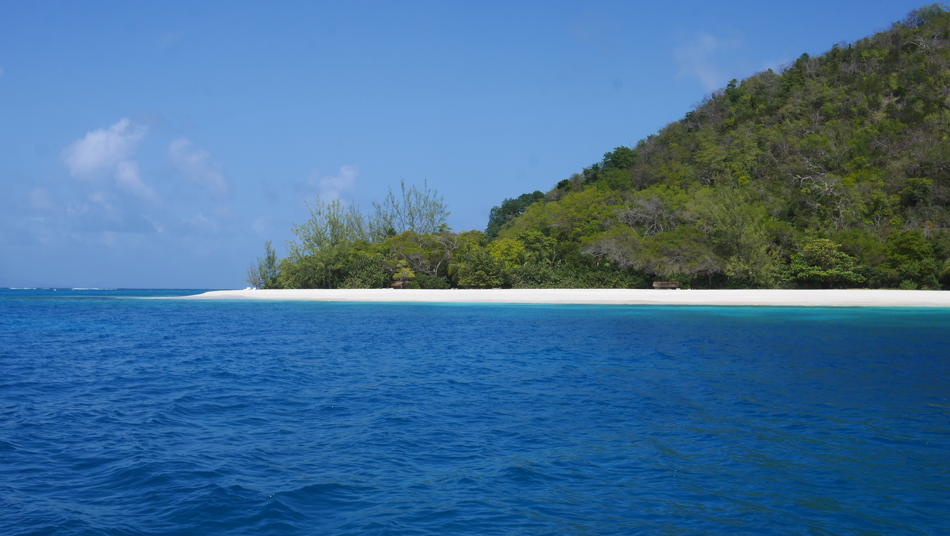 Cette île est splendide, la mer émeraude et translucide s’offre à nous à l’abris d’une petite falaise rougeoyante bordée d’une plage de sable gris. Des poissons coffres et diodons de roche s’installent sous notre coque toute la durée de notre escale. Plus au bord, des bancs de carangues blanches et de minuscules poissons s’entrecroisent. Ils semblent chercher à se camoufler des prédateurs se confondant avec le sable. Ils sont plusieurs milliers de 3 espèces bien distinctes. Nous sommes seuls et complètement isolés, nous nous sentons un peu Robinson, avec un sentiment mêlé d’idéalisme et d’une goutte inquiétude de ne savoir personne à proximité.