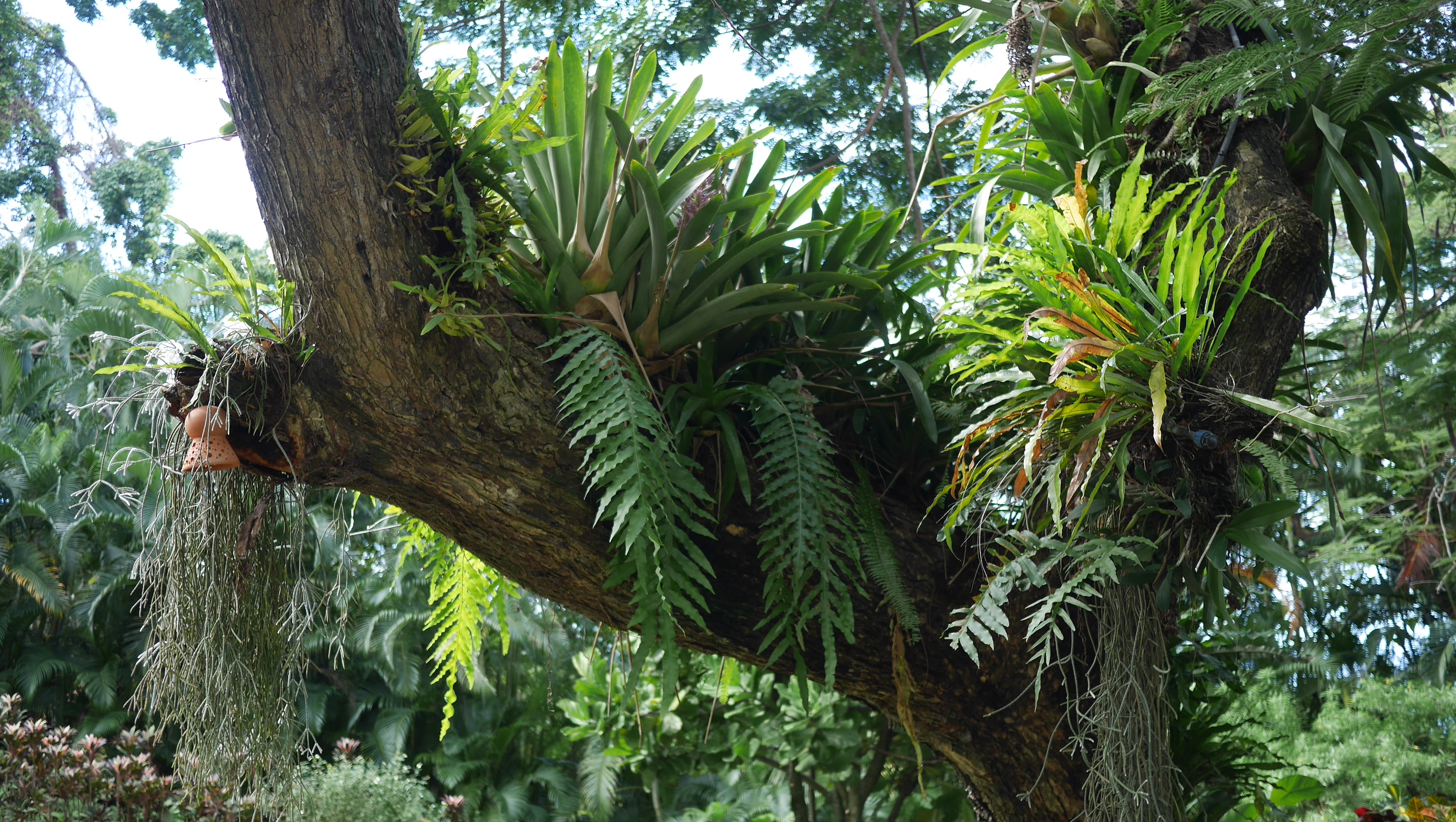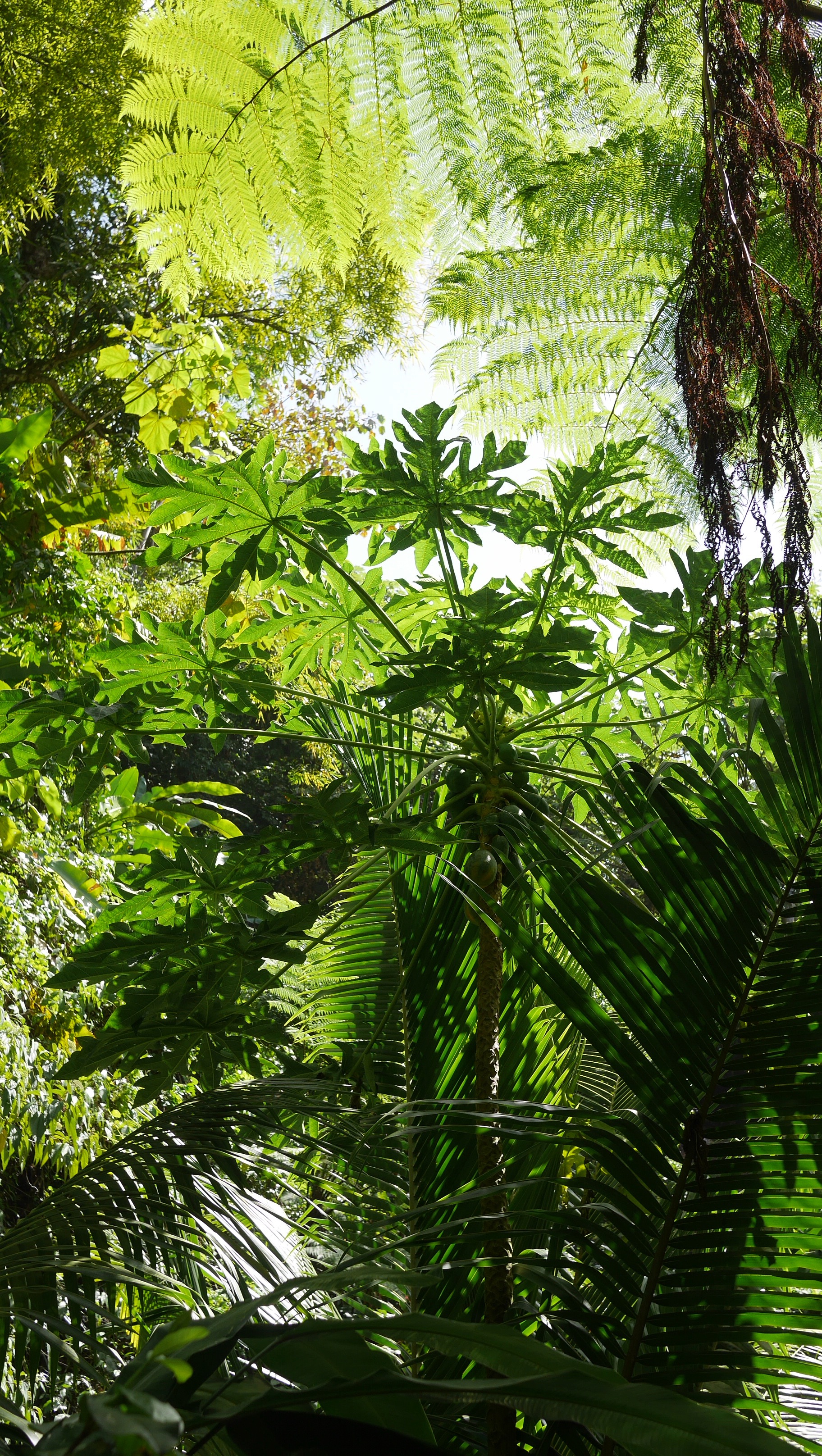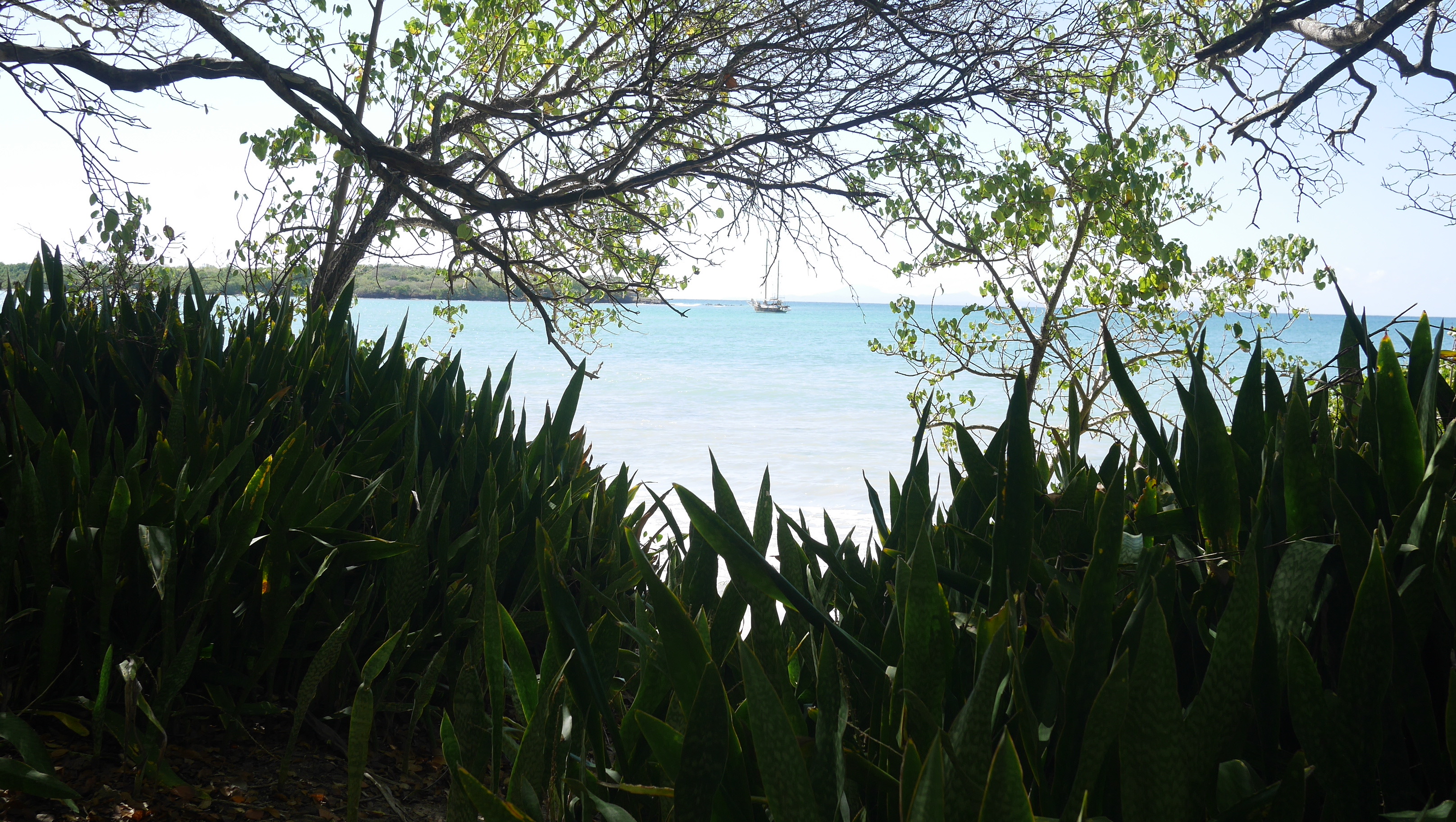 Après Antigua, nous traversons le canal pour mouiller l’ancre à Deshaie en Guadeloupe. À deux pas de là, le jardin botanique créé autour de l’ancienne maison de Coluche domine la baie. Ici, il pleut 18 fois par jour, les mornes qui entourent la baie accrochent les nuages, il fait super chaud, je crois que c’est ce qu’on appelle le climat tropical. La végétation y est luxuriante, c’est assez extraordinaire ce que la nature est capable de fabriquer d’elle-même. Nous nous promenons comme dans un musée à la découverte de ces peintures aux formes et aux couleurs si intenses et contrastées. Les végétaux s’entrecroisent, poussent les uns sur les autres, certains dominent, d’autres tapissent, certains grimpent, d’autres se balancent. Un écosystème qui s’alimente et abrite une variété d’oiseaux incroyables. Le palmier géant, le gommier rouge, le fromager, la rose de porcelaine, les pinces de crabe, et puis les colibris, les flamands roses, les loriquets.