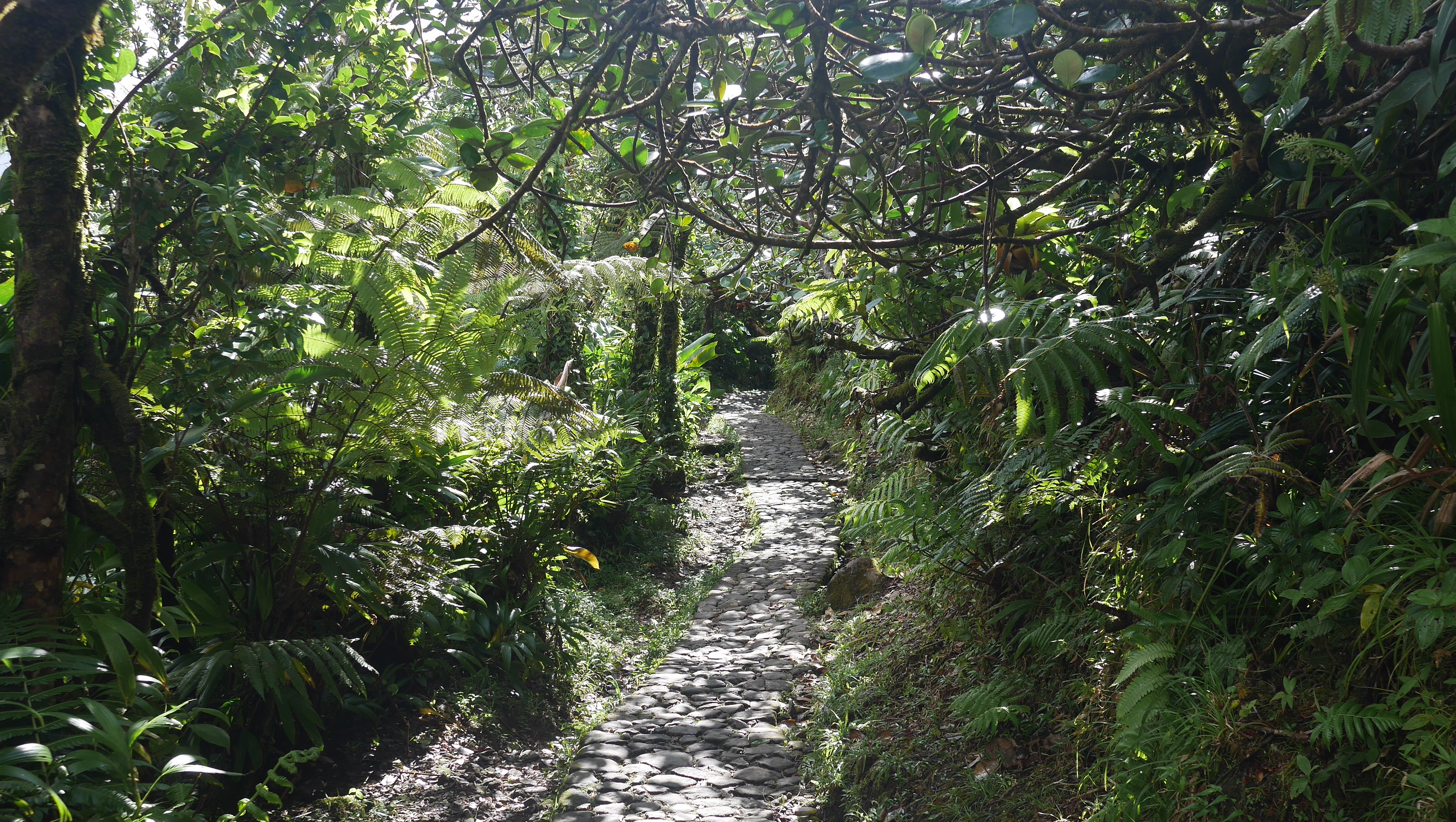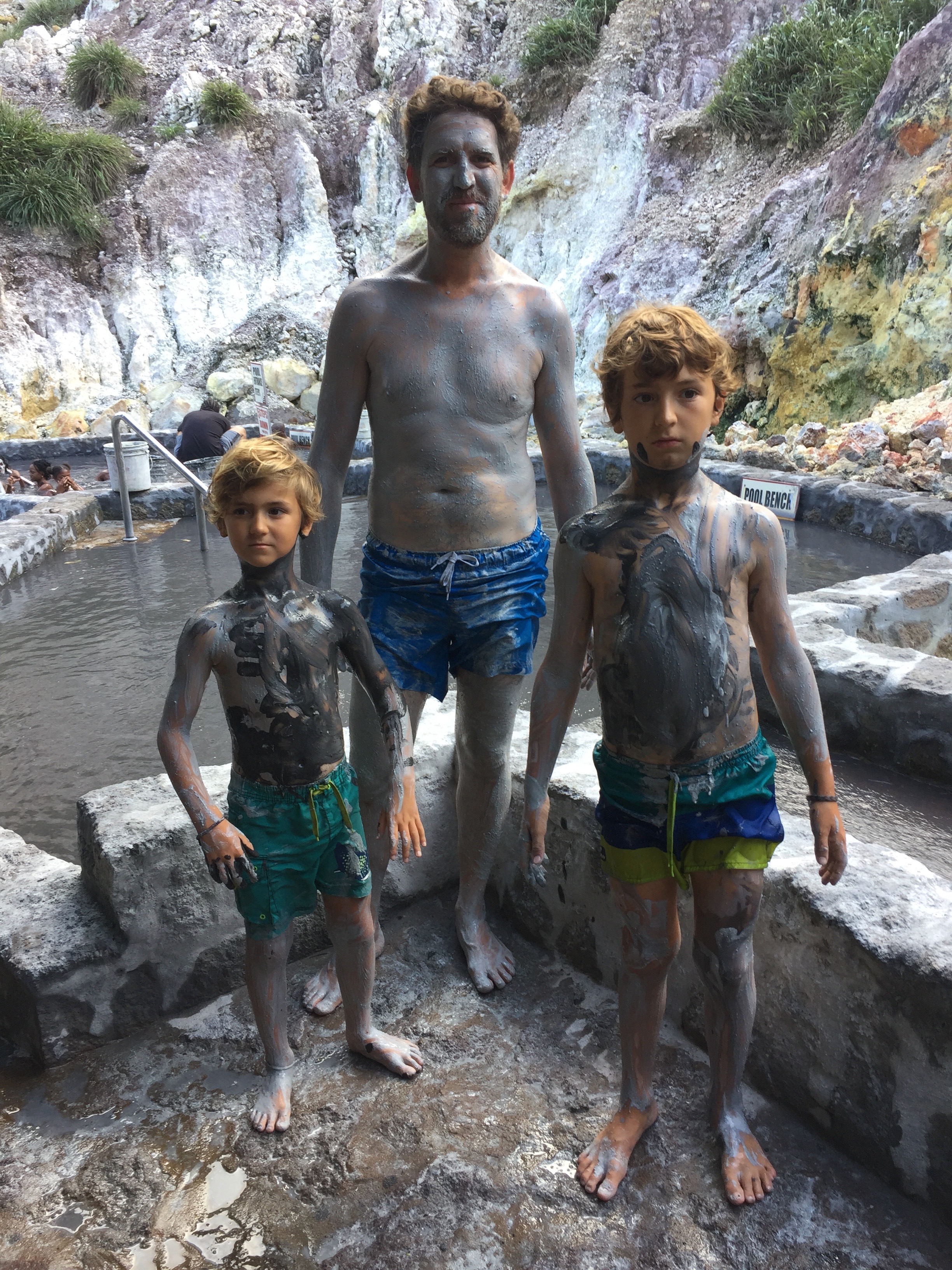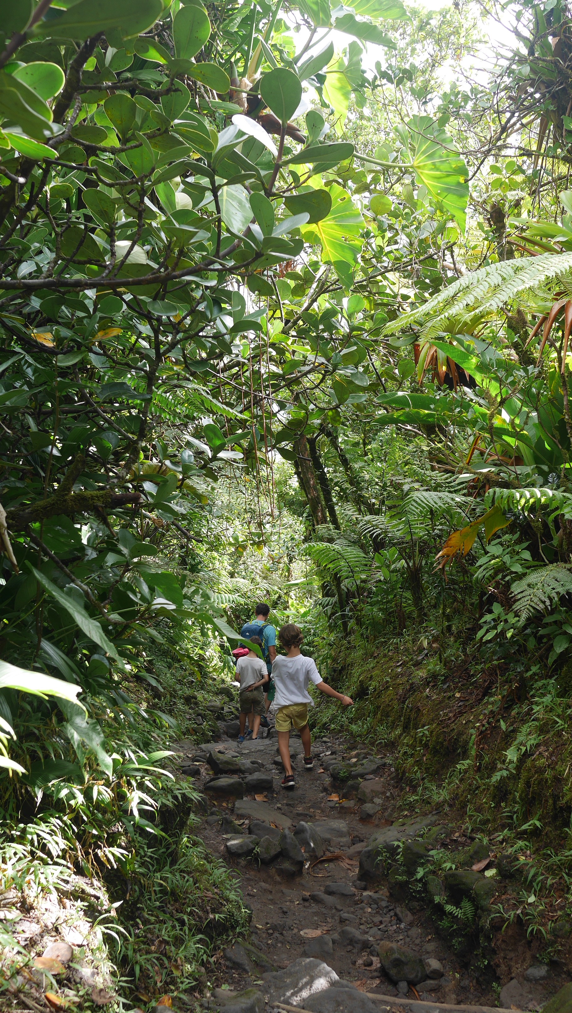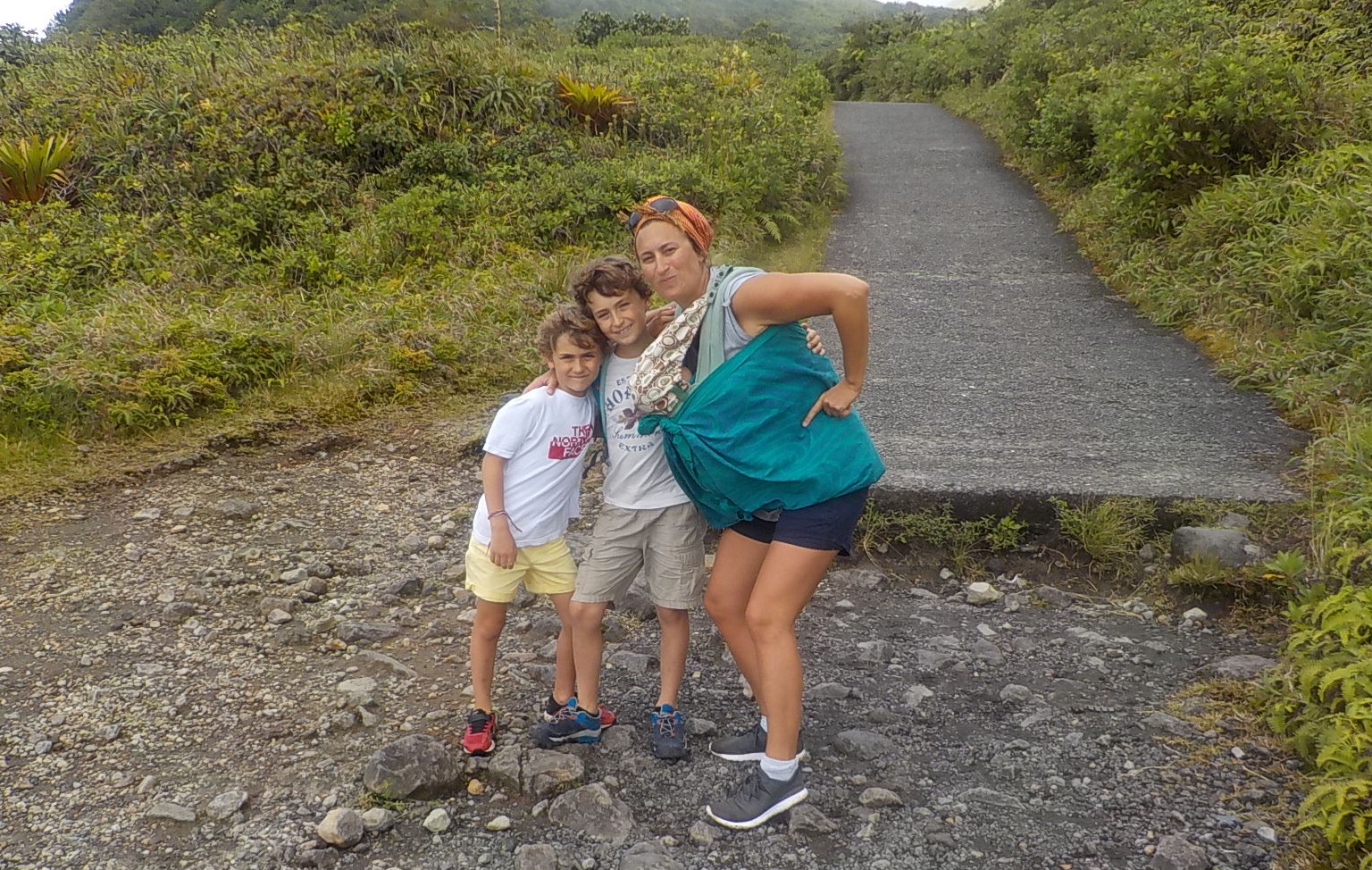 Après un baptême de plongée à la réserve Cousteau ( plongée complètement folle), Pointe Malendure, Florent, un copain nous prête sa voiture pour aller à La soufrière, le volcan qui domine la Guadeloupe à 1400m. Notre équipage émoustillé par la découverte de ce nouvel élément (et idéalement composé pour faire de la randonnée ) s’engage dans une randonnée de 5h. Quelques minutes avant le sommet quand on se demande s’il ne faudrait pas s’encorder, que tous les marcheurs (sans exception) que l’on croisent nous disent que ça ne passe pas avec deux enfants et un bébé, qu’il y 130 km/h de vent et qu’il fait 14 degrés au sommet, nous décidons finalement de faire demi-tour… ! Heureusement le paysage est grandiose, lianes, feuilles déployées de plus d’un mètre, fougères géantes, canopée nous dominant de plus de 20m sur un chemin calpiné de roche volcanique, puis la vue se dégage, nous apercevons au loin Les Saintes, la pente s’accentue, ça monte raide et le sentier s’immisce dans la roche pour traverser des failles humides et recouvertes de mousse rousse. Nous redescendons dans un brumisateur géant pour aboutir dans des sources d’eau chaude et sulfureuse. Nous sommes rincés.