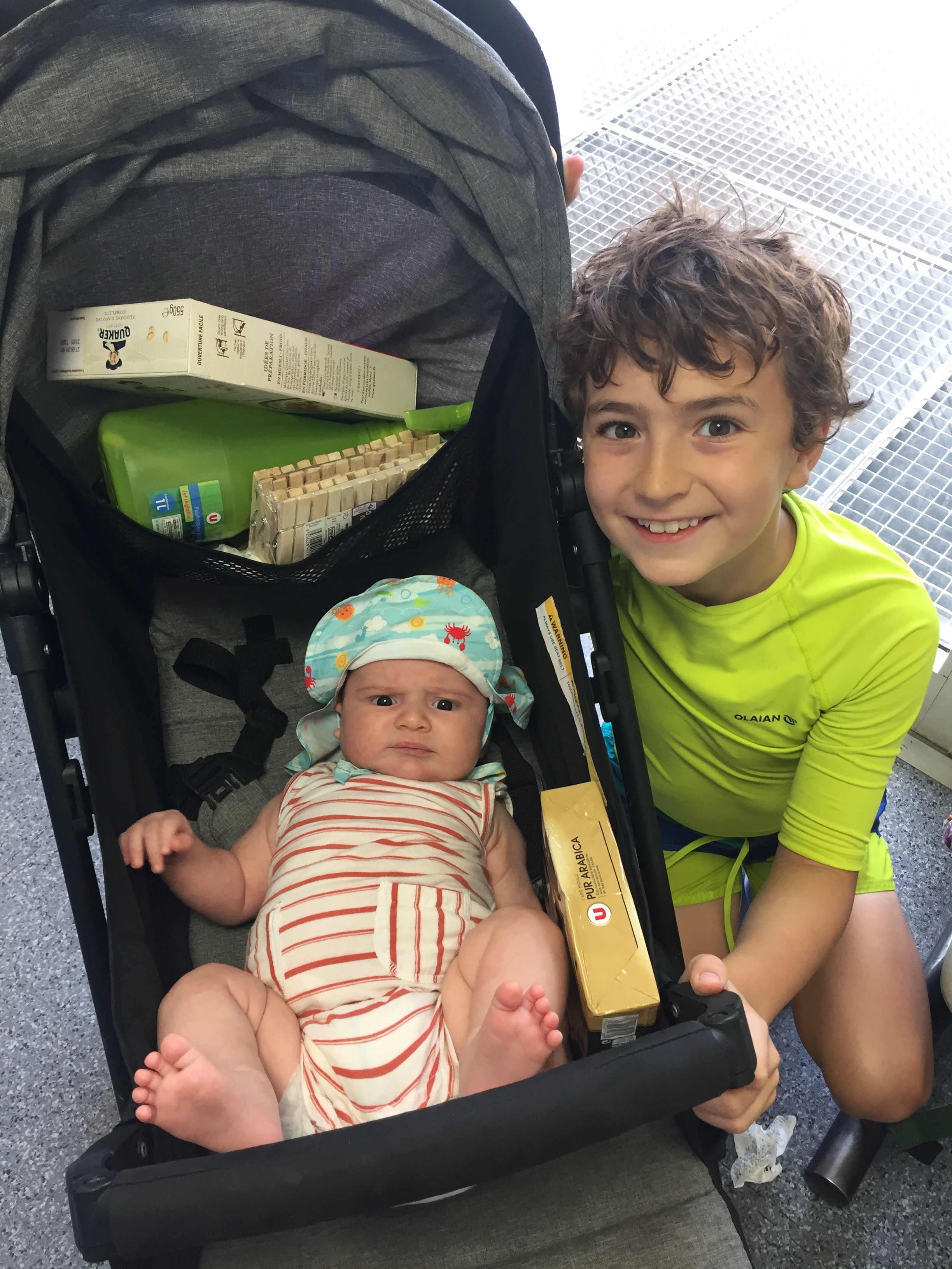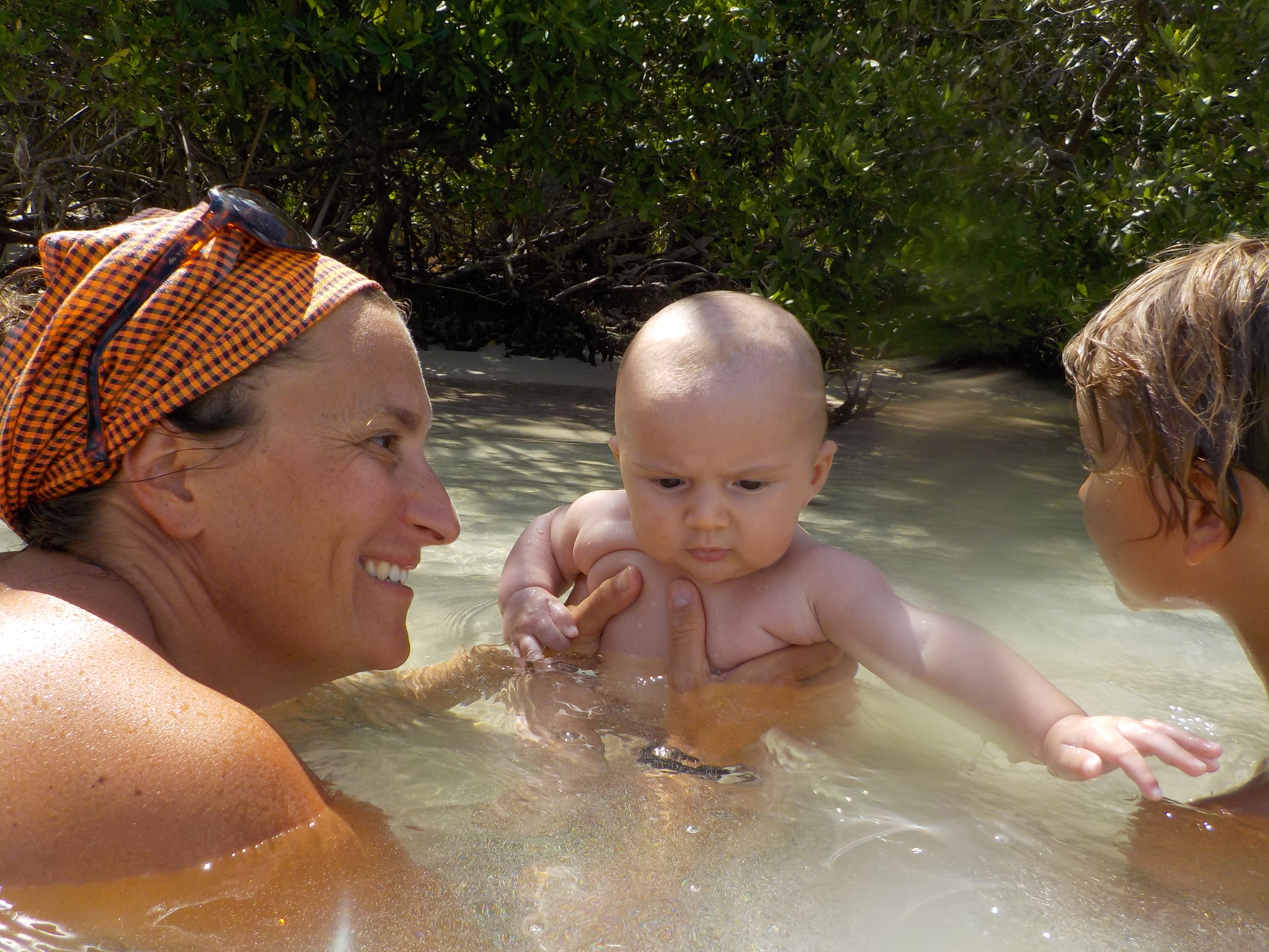 Bon évidemment, on a une petite inertie lors de nos départs à terre ou à la voile, mais on progresse. Au début, on comptait une heure, parce qu’évidemment au moment où tout le monde est prêt, il faut changer une couche ou faire une tétée. Maintenant on compte une demi heure voir même 15 minutes quand on oublie tout. On progresse! Faire la bouteille d’eau, prendre les claquettes, fermer les hublots, remonter le paddle, prendre le porte bébé, le coupe circuit, les casquettes, et… le bébé quand l’annexe est démarré et que tout est prêt!