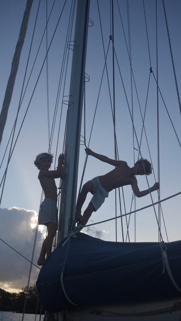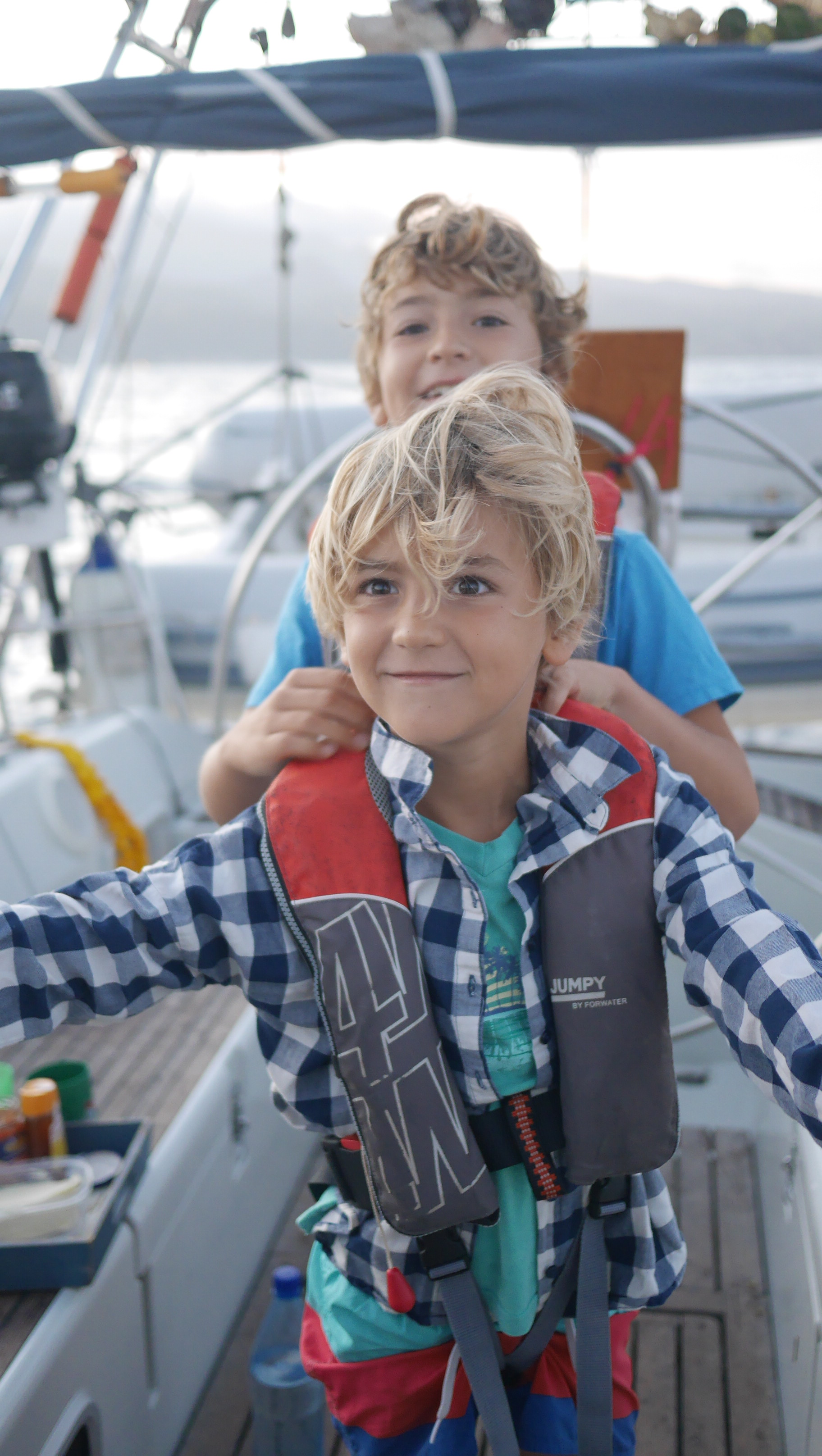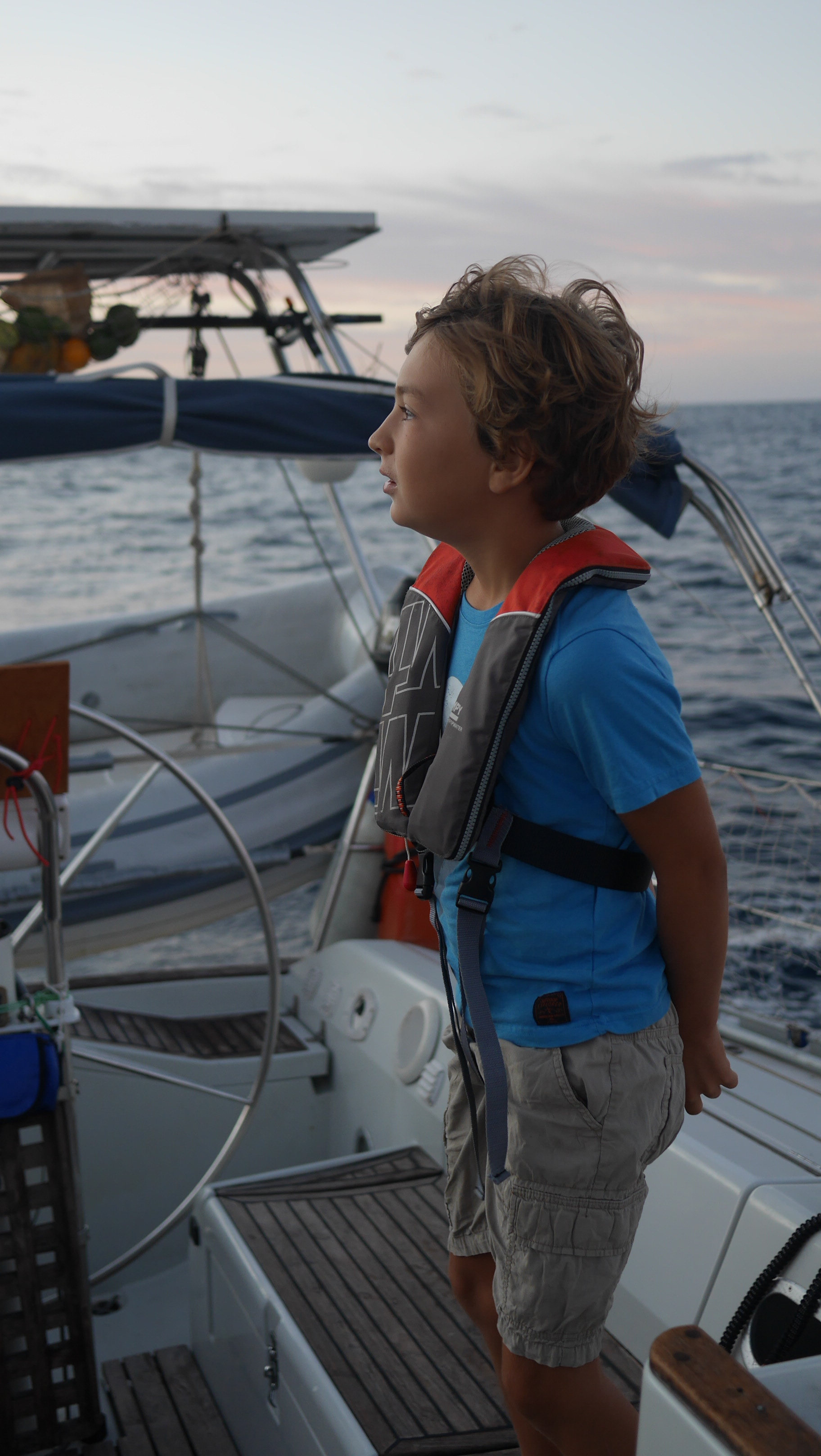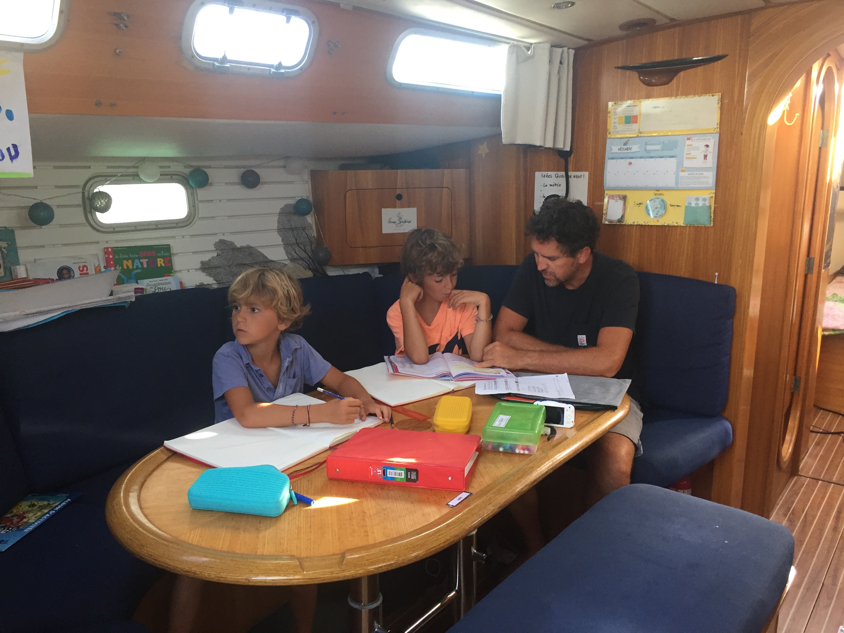 Les enfants en mer, ils apprennent que la nature est plus forte qu’un caprice, ils participent aux manoeuvres, s’orientent et font la route, ils s’expriment avec des adultes, ils font à manger et font la vaisselle (bon ok, il faut leur répéter 10 fois, mais ils le font!) Ils nagent, plongent, savent reconnaitre tous les types de bateaux que l’on croise, les poissons que l’on voit et les coraux. Mais surtout il savent que tout peut changer, qu’une rencontre, une discussion, une prévision météo ( ou un virus) peut faire basculer tous les plans et ils s’adaptent. Ce qui est absolument chouette, c’est d’avancer sur un bateau, notre repère qu’ils connaissent par cœur et sur lequel ils sont totalement à l’aise. C’est un petit environnement bien confiné à leur échelle où chaque chose à sa place, chaque bruit à son sens, chacun à son rôle.