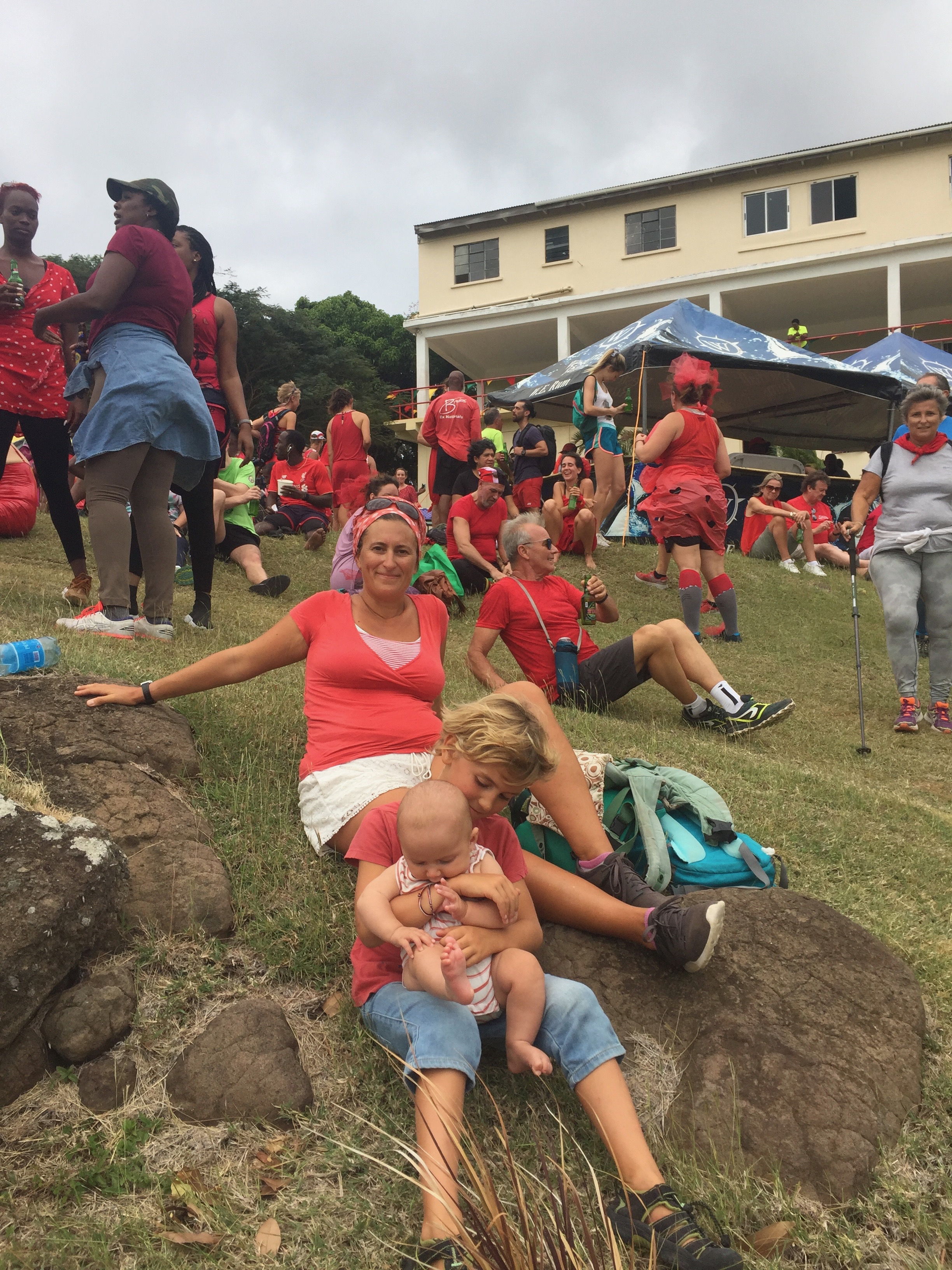 Il est 15h, Bruno nous attend, 15 minutes plus tard nous nous retrouvons avec une centaine de personnes habillées en rouge pour ce fameux Hash, un jeu de piste. Un rond au sol, il y a deux chemins possibles, une croix, on fait fausse route. Les « runners » mènent la route. « On on » on continue. « On back » on revient. L’ambiance est totalement délire, ça crie, ça s’interpèle, ça sue, ça jase, on se marre! Après une heure et demi de marche, la boucle est bouclée, la fête commence. Sono à fond, soupe de lambi et poulet boucané, c’est le party en plein air jusqu’à épuisement!